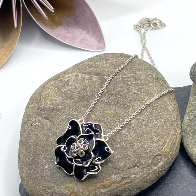 An integral pendant necklace in sterling silver this has a gorgeous, large, multi-petal, black enamel flower and 6 central salt and pepper colour round faceted CZs with a secure ring clasp.