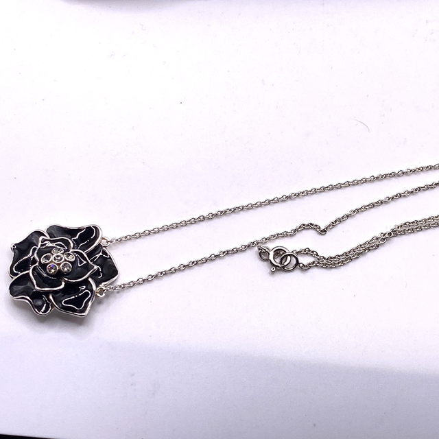 REFURBISHED Black Enamel Flower Sterling Silver Pendant Necklace 18"
