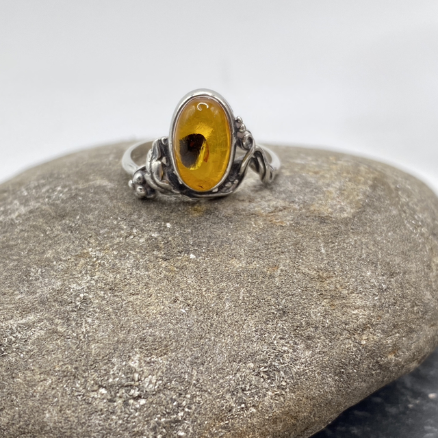A beautiful vintage ring with a large amber cabochon on a delicate sterling silver scrolled band. The stone is set so it rises up like a crown (or drops down if you prefer to stack another ring on top) from the band making a real central feature. The amber contains a visible inclusion of an organism trapped inside the resin.