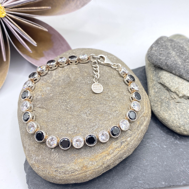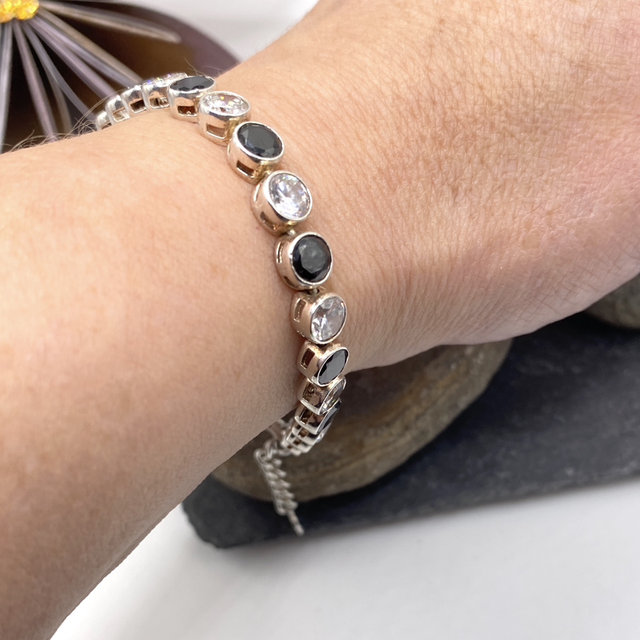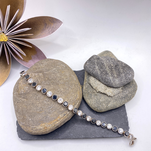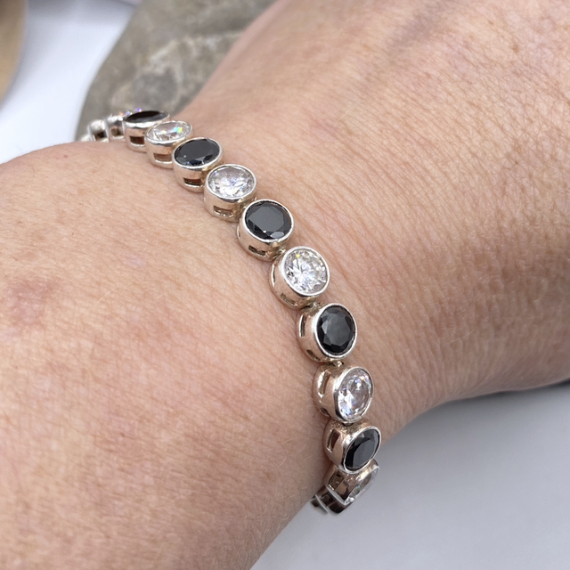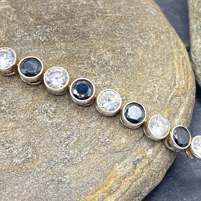 A lovely vintage tennis bracelet set with alternating round, faceted stones in dark blue sapphire and clear CZ, all in sterling silver. It has a lobster clasp and extension chain to adjust for a comfort fit.