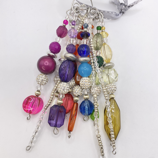 A handmade cascaded icicle decoration with eight separate large beaded icicles in a rainbow of colours, and three thinner icicle stranded in clear and silver beads, all on silver plated wire. Made by repurposing beads from vintage jewellery. Finished with a grey ribbon ready to hang from your tree.
