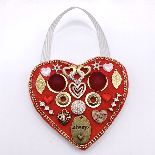 Hand decorated Red felt on Wooden Heart with repurposed jewellery elements including gold tone hearts + 'Always'
